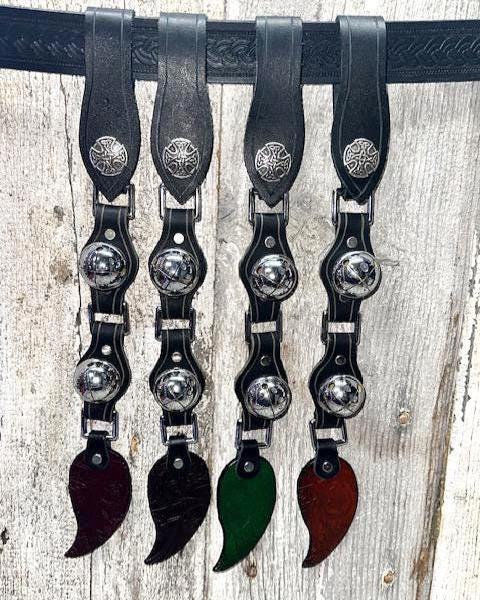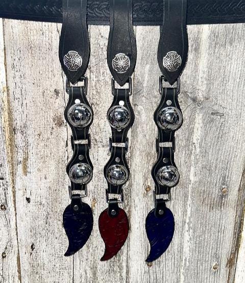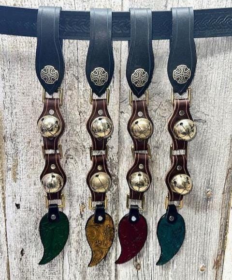 Made of leather and metal, this strand has two sleigh bells with a leaf medallion at the bottom. A belt loop with a snap is located at the top for easy on and off.